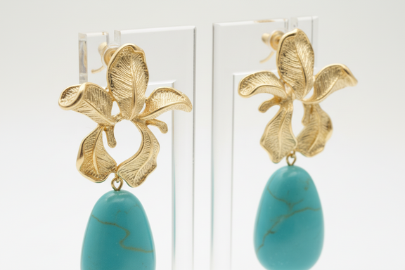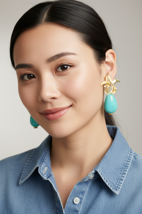 Make a graceful statement with these elegant gold floral drop earrings, designed to embody femininity, confidence, and timeless beauty. Featuring sculpted gold-tone flower accents paired with smooth turquoise teardrop stones, these earrings add a pop of color while remaining effortlessly sophisticated. Lightweight yet eye-catching, they are perfect for brunch dates, special occasions, or elevating your everyday look.